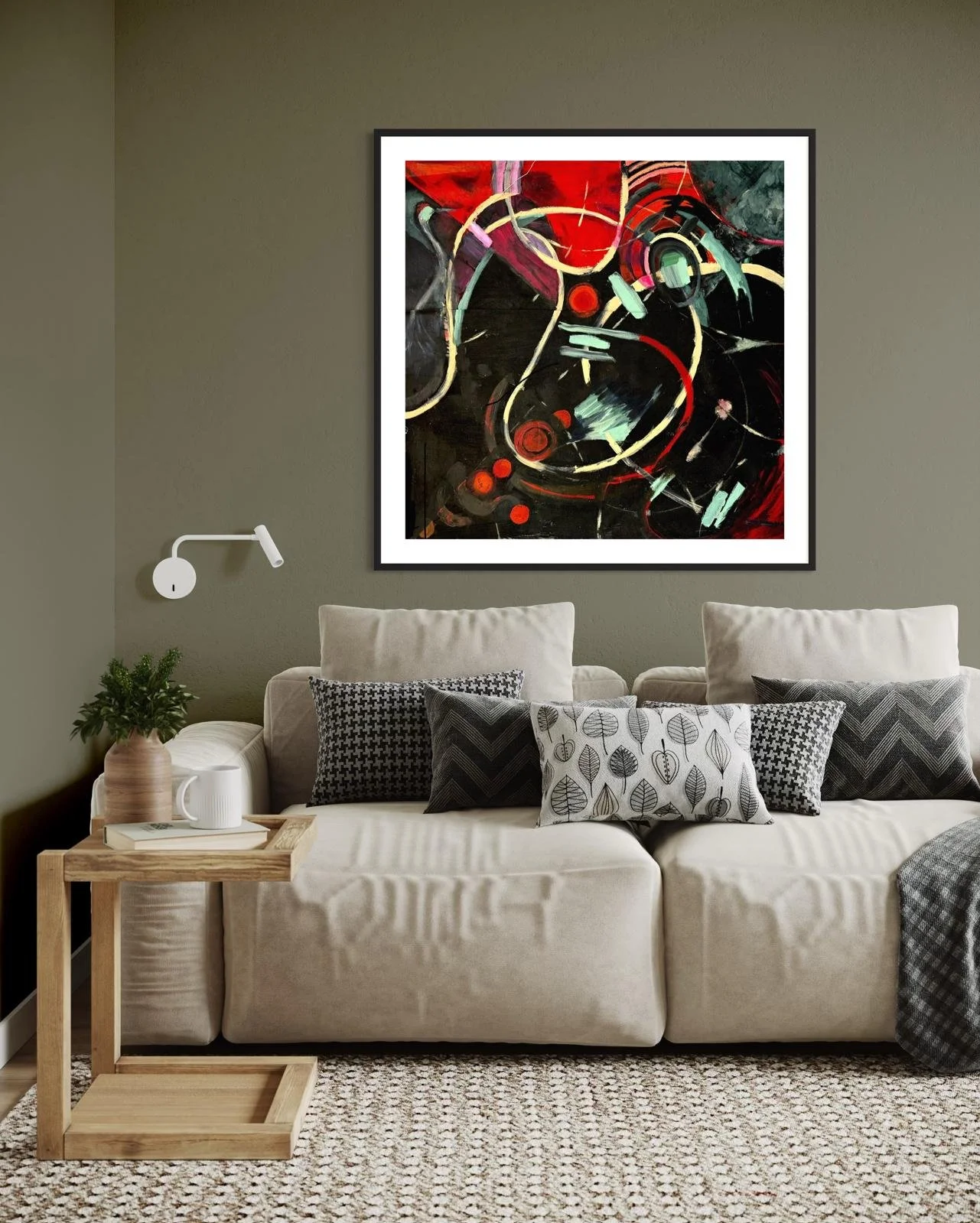 This dynamic composition captures the vibrancy and chaos of a bustling night in London, a tapas bar and chitter-chatter ,with a whirlwind of colours and form.