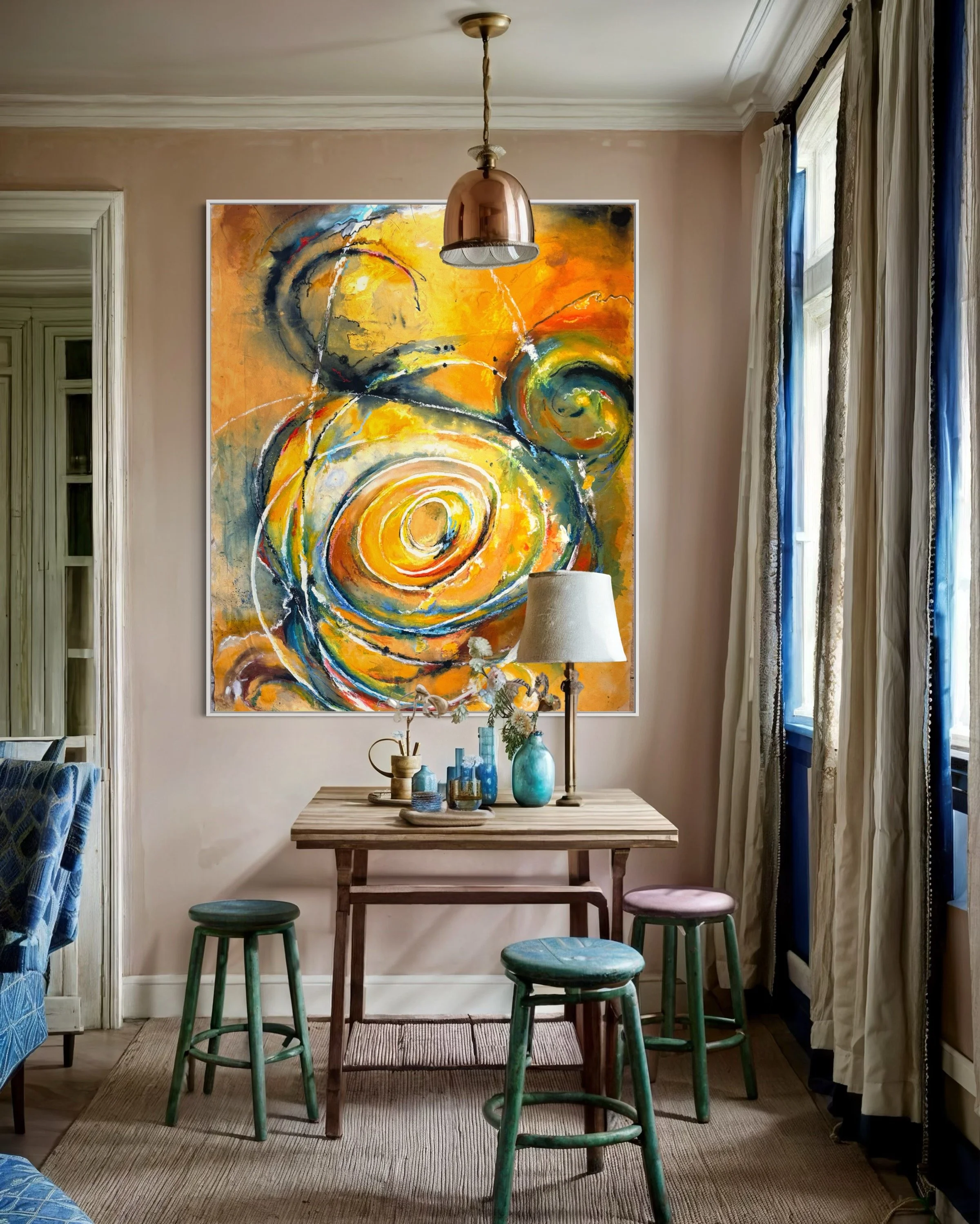 A vibrant interplay of circles and colours intertwine in a whirlpool of citrus harmony, capturing the essence of a summer song you haven’t listened to in years.
